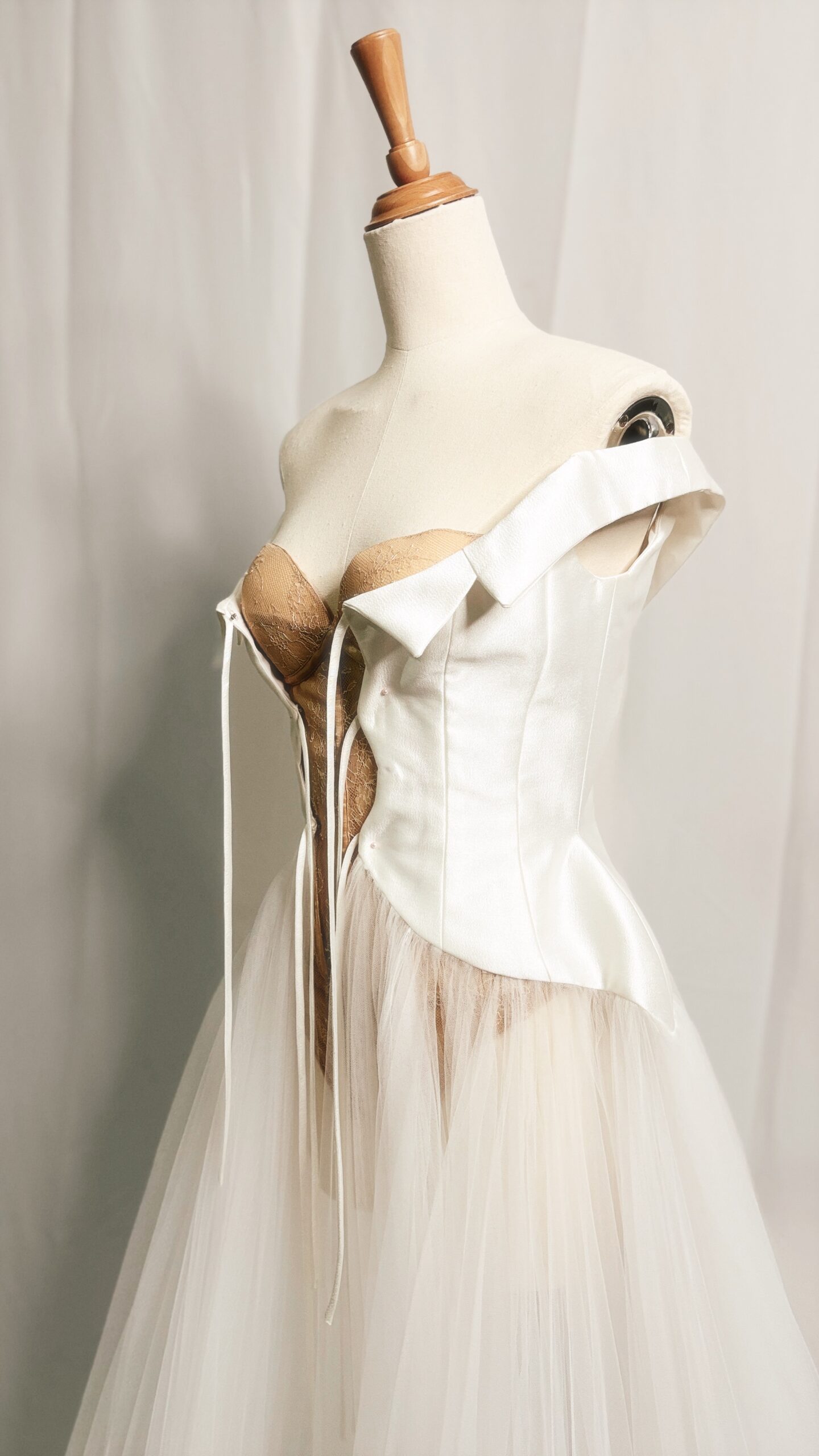 This off-shoulder bridal robe features a structured lapel that blends classic tailoring with soft femininity. Crafted from semi-transparent tulle in an A-line silhouette, it flows effortlessly with every movement, creating a dreamy, ethereal effect. The look is completed with an inner Chantilly lace bodysuit corset in skin tone, offering soft structure and subtle allure.