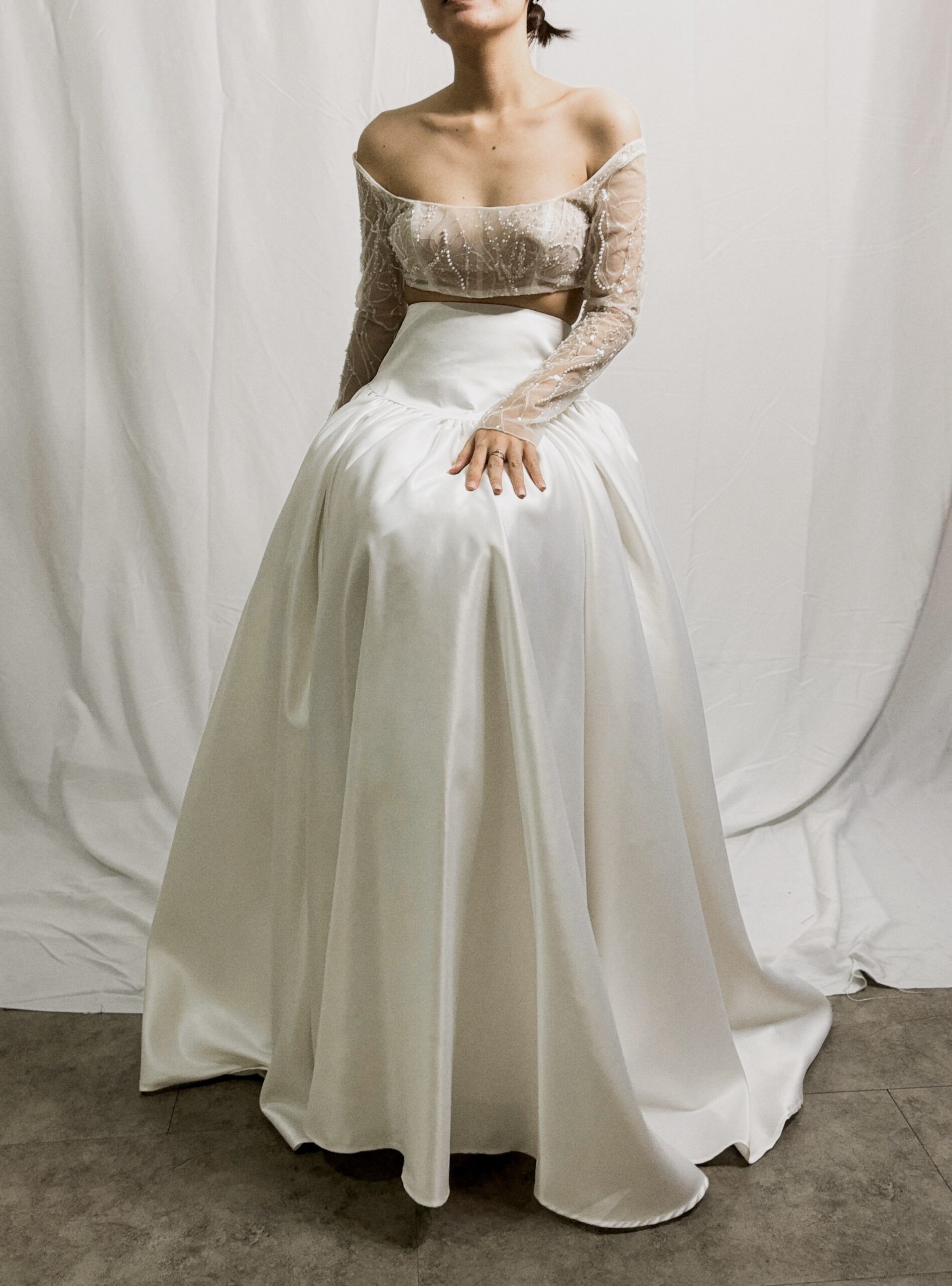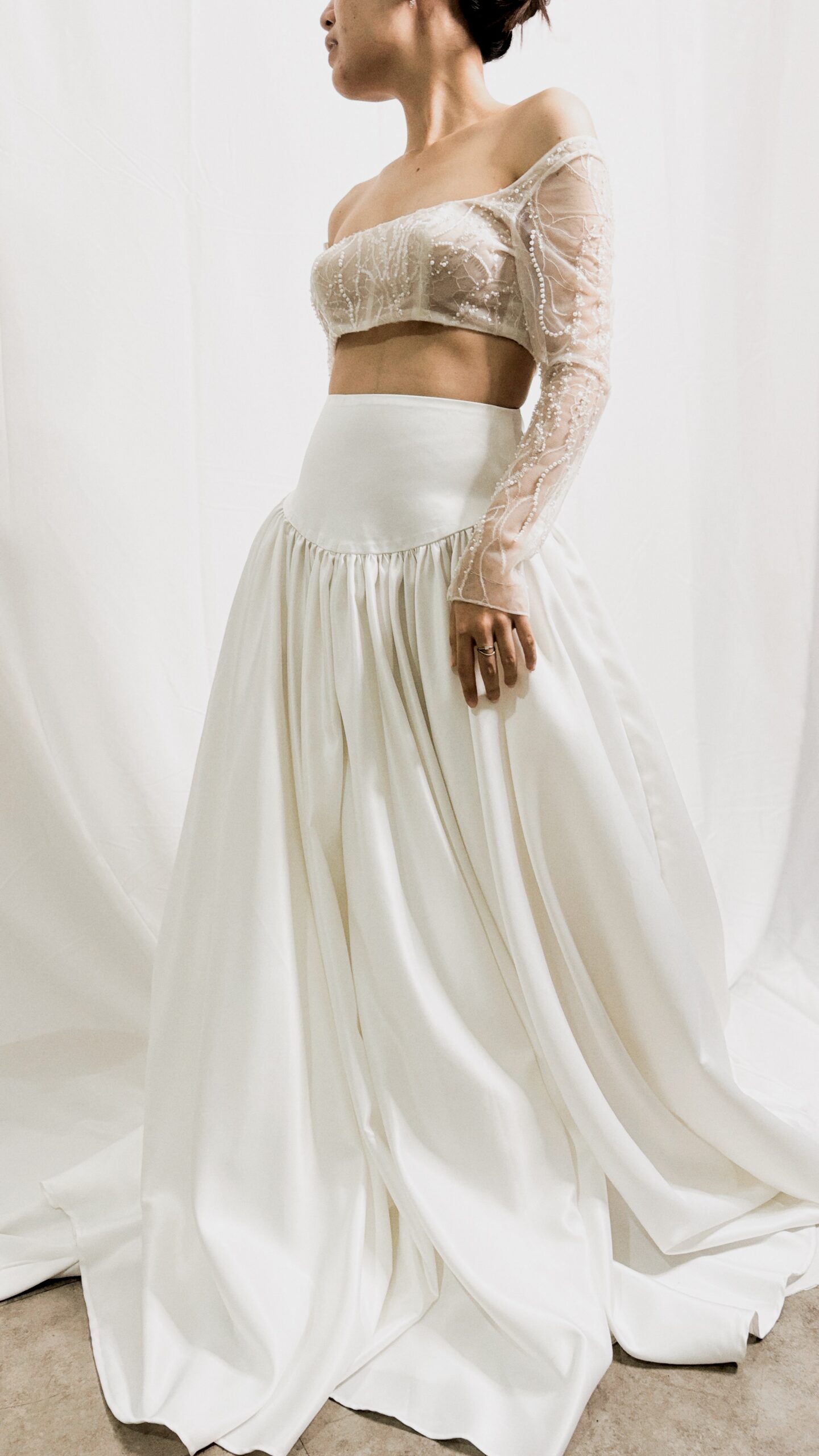 This off-shoulder crop bustier (bralette) is crafted from delicate lace and hand-applied beads, offering a soft, romantic glow. Paired with a high-waisted silk skirt featuring gentle gathering at the hip